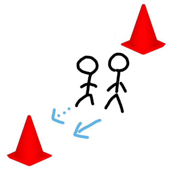 守備側のスタートの合図で、攻撃側は左右どちらかのコーンをタッチしに行きます。